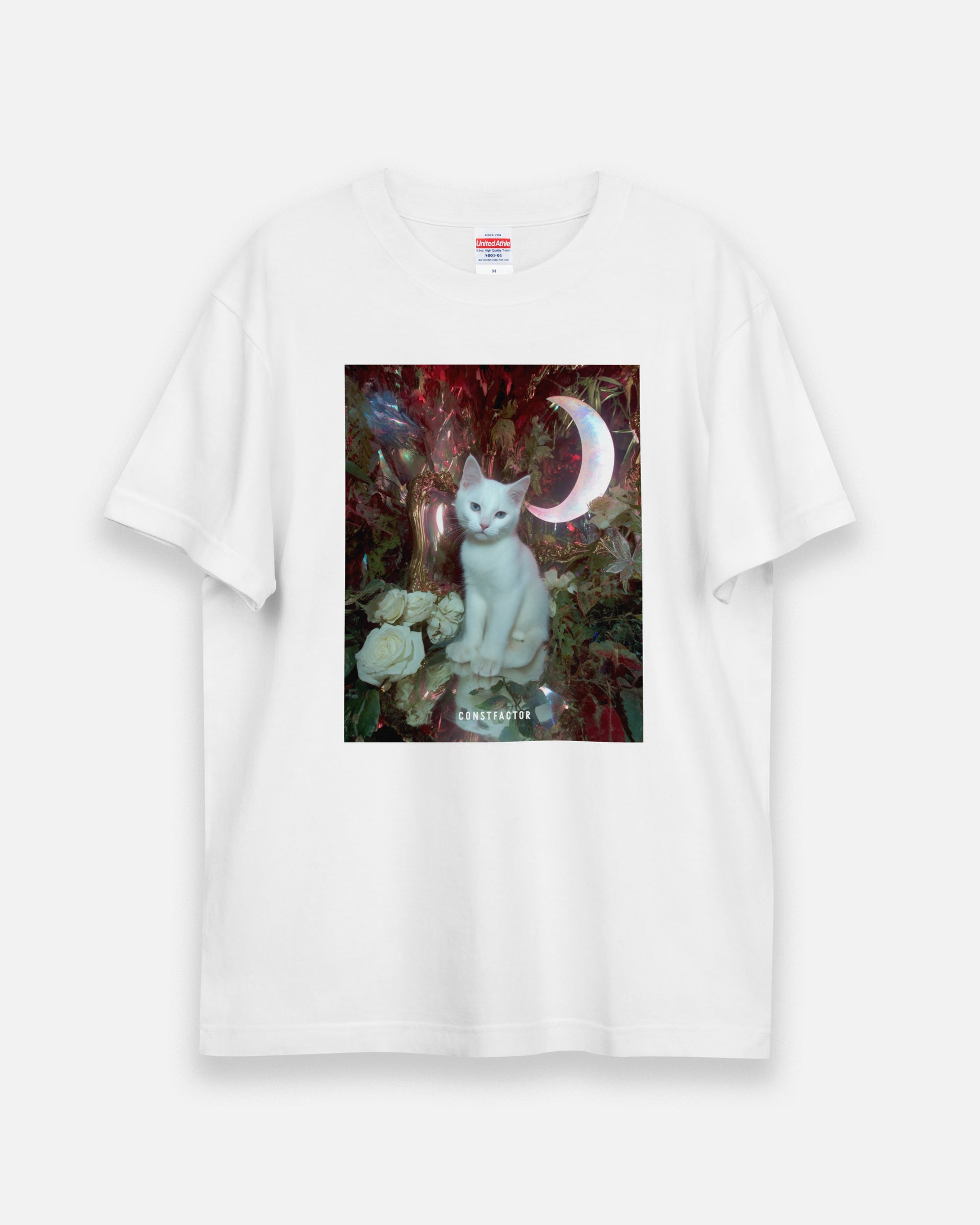 A white cat surrounded by a crescent moon and white roses. #TheMoonIsBeautifulSyndrome.