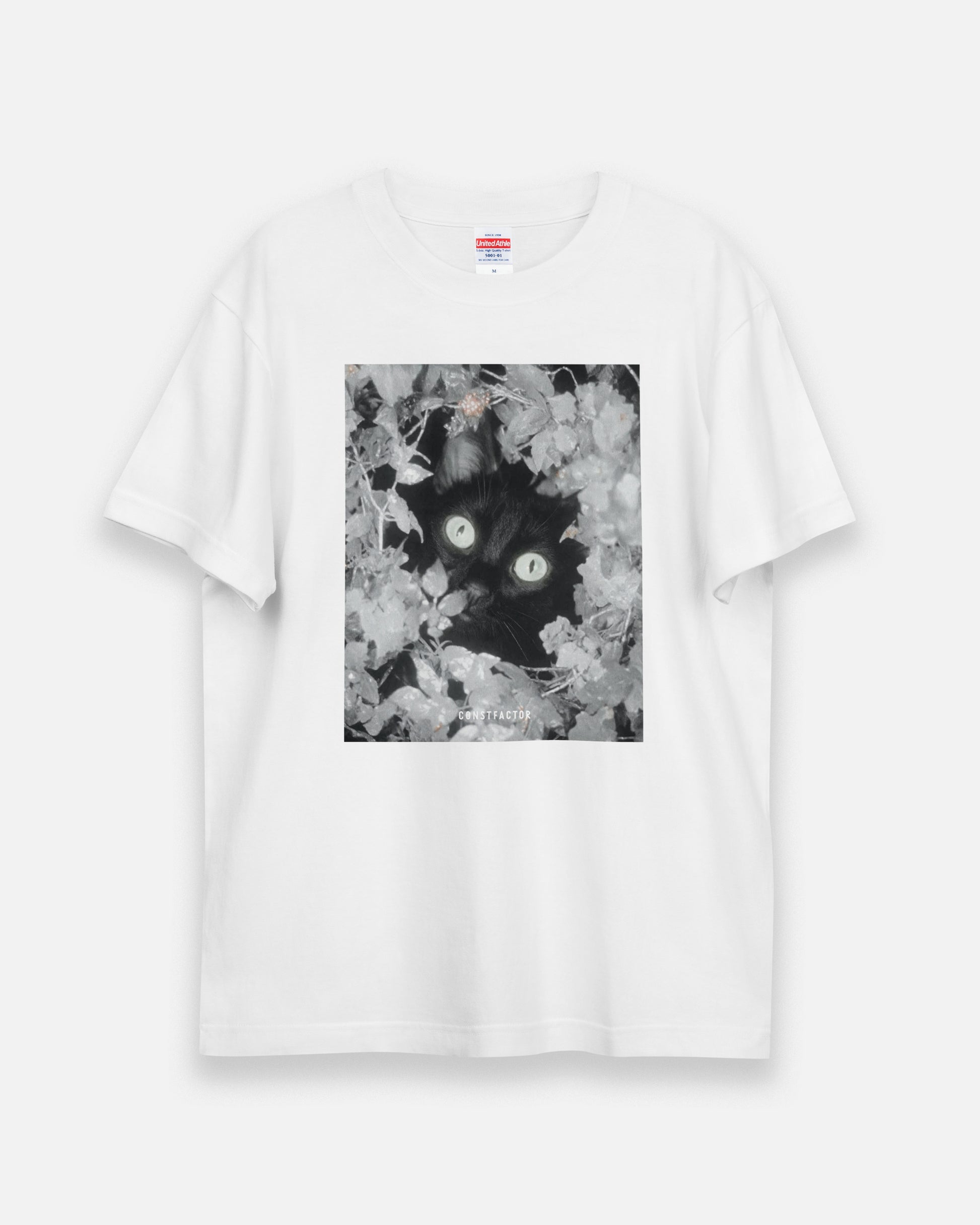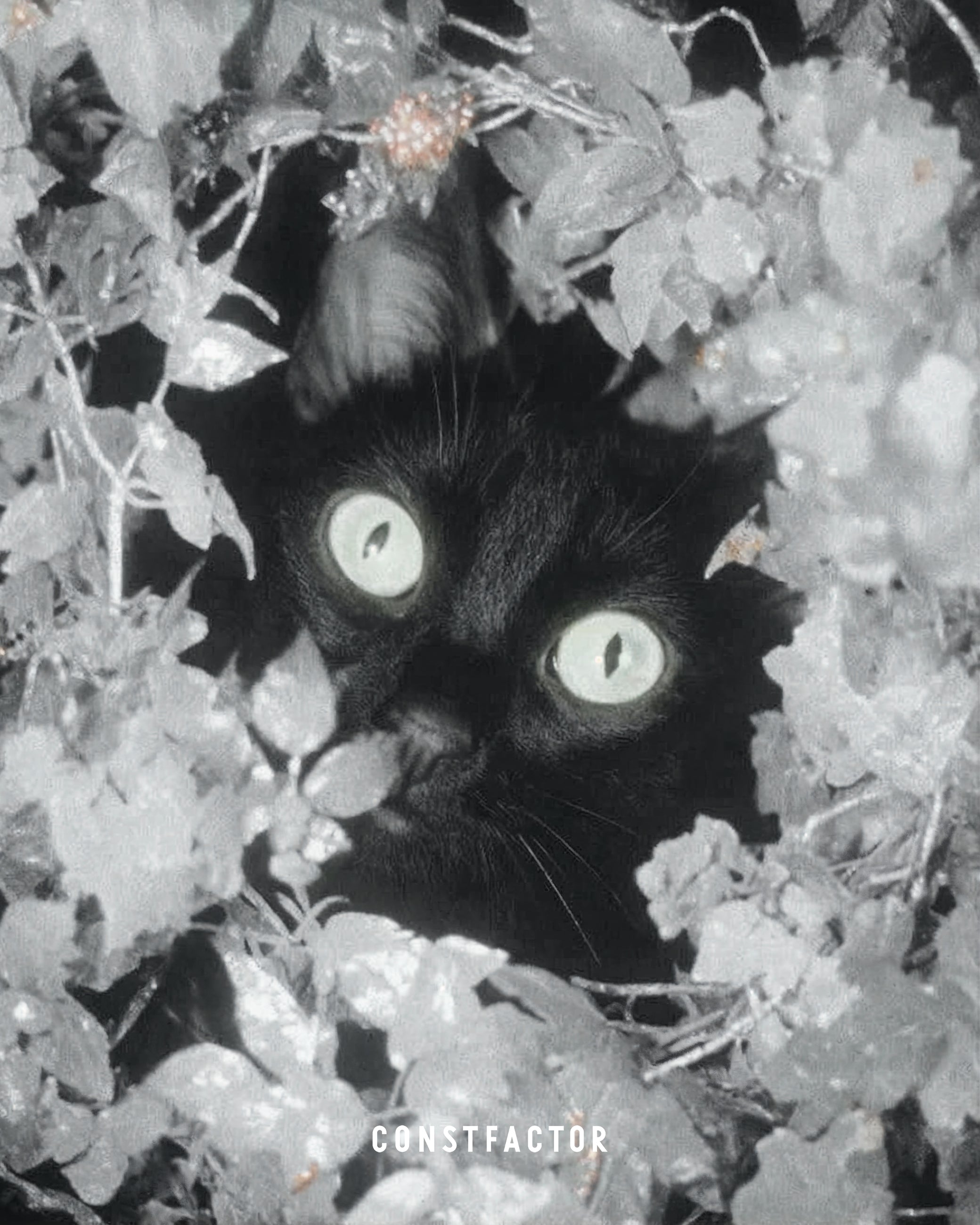 灰色の葉の中から顔だけのぞく黒猫。100%ステルス失敗。
